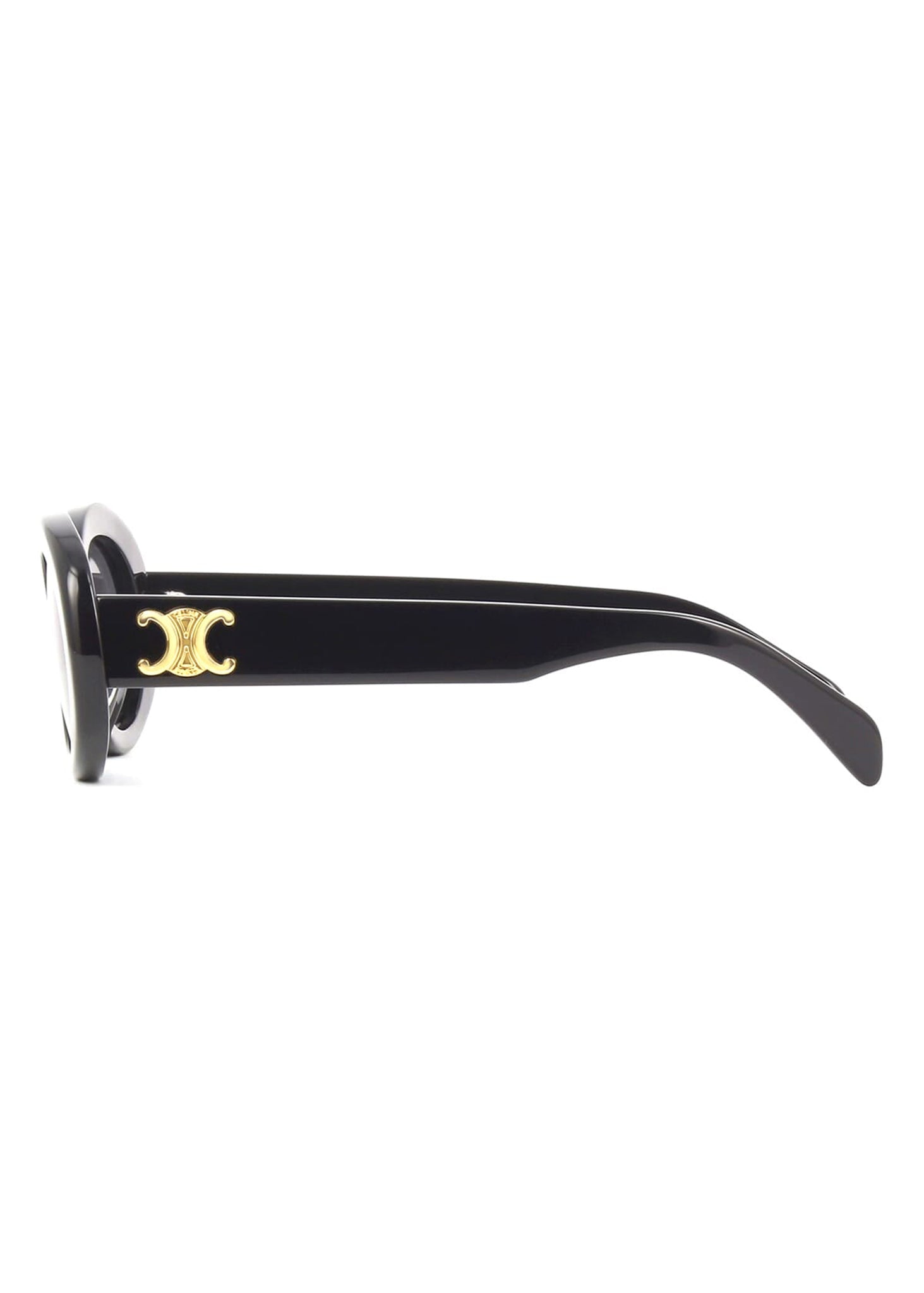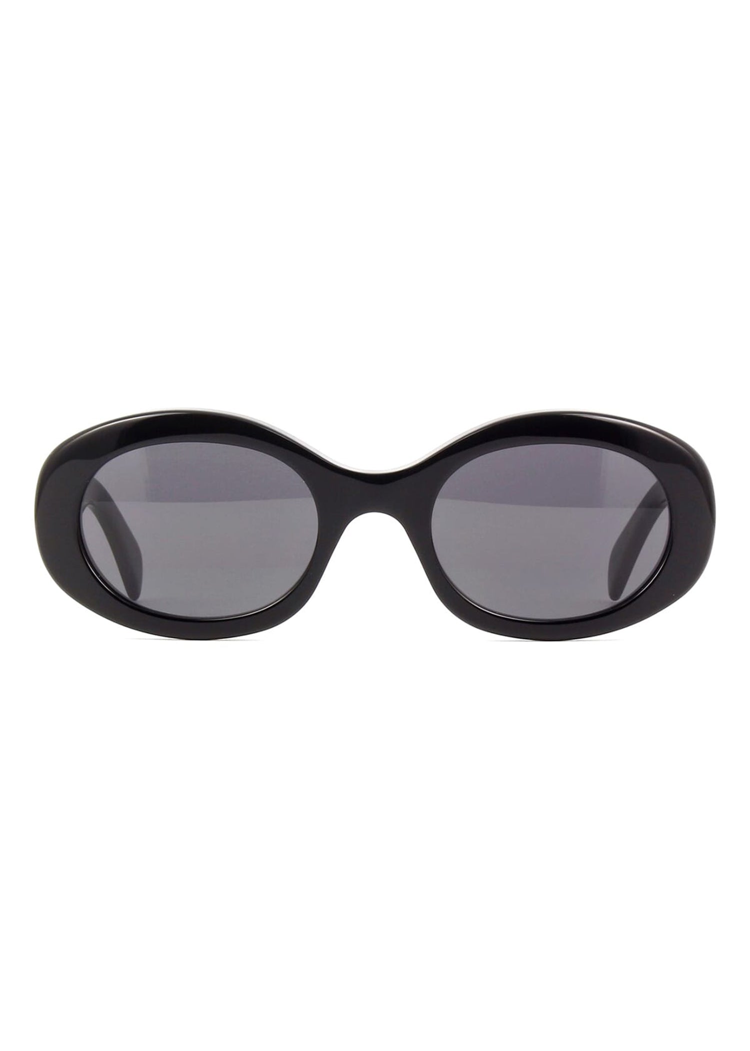 This round Celine Triomphe sunglass comes in a shiny black frame with dark grey smoke lenses.