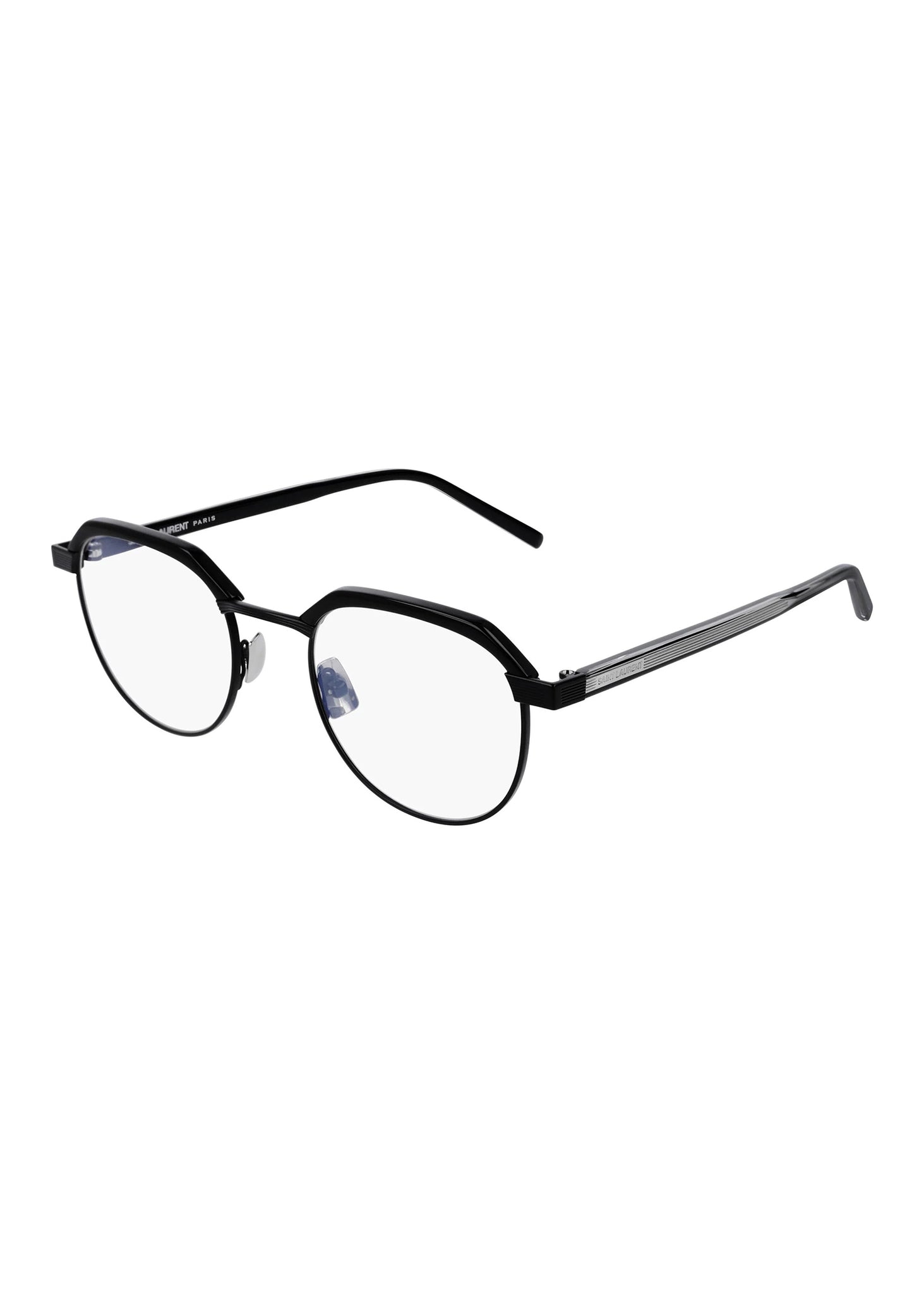 Combined round style. 3D laser-engraved corner angle and striped metallic details. Retro '70s style: acetate tabs, metallic nose pads. Lightweight material. Laser-engraved Saint Laurent logo on the outside of both temples.